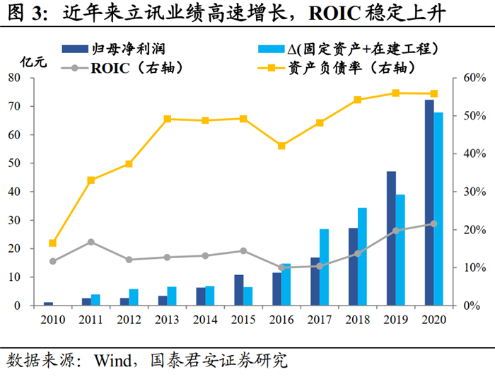 2021年3月末公司商譽12.28億元,在總資產(chǎn)中占比僅為1.4%,說明這些被收購公司基本上是以當時的凈資產(chǎn)公允價值收購的。2010-2020年立訊的歸母凈利年均復合增速達51.2%,不斷擴張的同時ROIC保持穩(wěn)定,近年來呈現(xiàn)上升趨勢,立訊對收購資產(chǎn)的整合能力可見一斑。