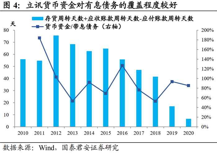 立訊在不斷融資擴張的同時,貨幣資金對有息債務的覆蓋程度始終保持在較好的水平。從資金使用效率來看,公司的現(xiàn)金周轉(zhuǎn)周期(存貨周轉(zhuǎn)天數(shù)+應收賬款周轉(zhuǎn)天數(shù)-應付賬款周轉(zhuǎn)天數(shù))呈明顯下降趨勢,說明公司對上下游的話語權(quán)在提升。