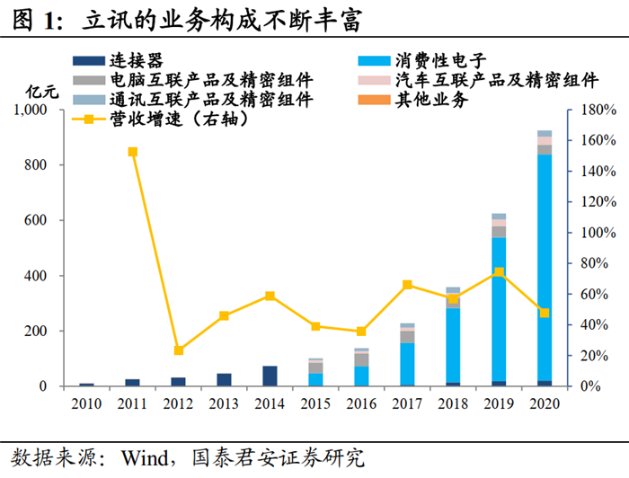 立訊靠生產(chǎn)電腦連接器起家,成立之初50%以上的訂單來自富士康。在上市的第二年(2011年),立訊通過收購昆山聯(lián)滔電子60%的股權(quán),正式切入蘋果供應鏈。同年8月,立訊收購科爾通訊邁入通信領(lǐng)域;2012年收購福建源光電裝切入汽車電子領(lǐng)域,同年收購珠海雙贏進入FPC領(lǐng)域;2014年收購蘇州豐島,進入可穿戴設(shè)備領(lǐng)域。