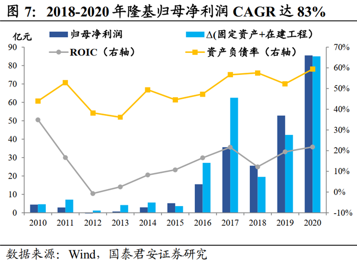 從隆基的發(fā)展來看,公司每一步的產(chǎn)能布局和落地,都是基于對行業(yè)趨勢的準確預判,在對自身的成本優(yōu)勢和資金實力的充分認識下做出的戰(zhàn)略規(guī)劃,而非沖動決策。首先,隆基一直堅持“不領(lǐng)先不擴產(chǎn)”的原則,確保新增產(chǎn)能的技術(shù)領(lǐng)先行業(yè);其次,公司嚴格控制負債率,保證資金上的充裕,資產(chǎn)負債率始終維持在60%以下,2020年底公司賬面上有大量的貨幣資金,是有息負債的2.5倍;第三,公司商譽占比很小,擴張主要依靠自建產(chǎn)能而非外延式并購。