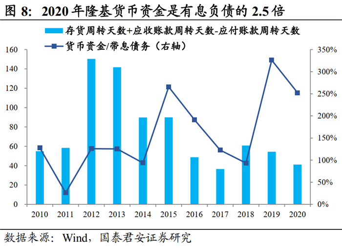 2018-2020年成為隆基增長最快的三年,歸母凈利潤年均復合增速達到了前所未有的83%,公司的增長跨上了新的臺階。同時, 2018年以來公司現(xiàn)金周轉(zhuǎn)周期呈下降趨勢,經(jīng)營效率明顯提升。整體來看,公司的財務數(shù)據(jù)非常健康。