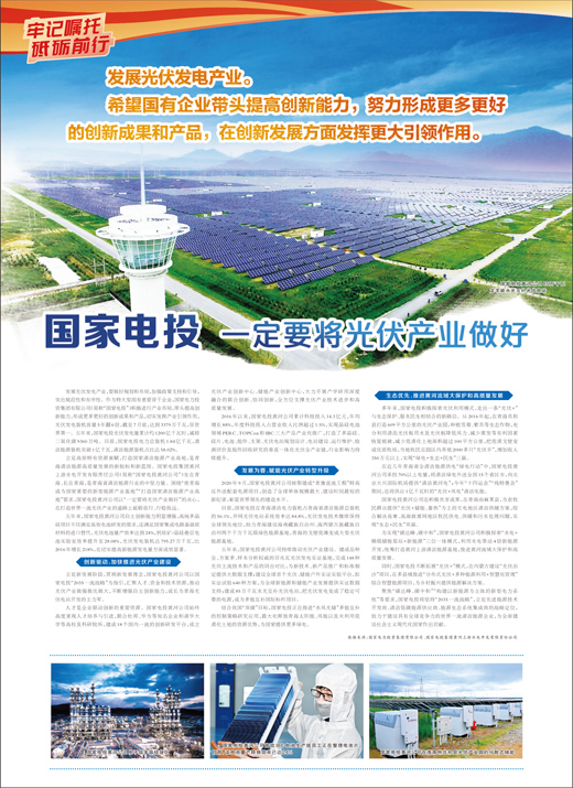 發(fā)展光伏發(fā)電產(chǎn)業(yè),要做好規(guī)劃和布局,加強政策支持和引導,突出規(guī)范性和有序性。作為特大型國有重要骨干企業(yè),國家電力投資集團有限公司(簡稱“國家電投”)積極進行產(chǎn)業(yè)布局,帶頭提高創(chuàng)新能力,形成更多更好的創(chuàng)新成果和產(chǎn)品,切實發(fā)揮產(chǎn)業(yè)引領作用,光伏發(fā)電裝機容量5年翻6倍,截至7月底,達到3379萬千瓦,居世界第一。五年來,國家電投光伏發(fā)電量累計約1200億千瓦時,減排二氧化碳9360萬噸。目前,國家電投電力總裝機1.84億千瓦,清潔能源裝機突破1億千瓦,清潔能源裝機占比達58.02%。