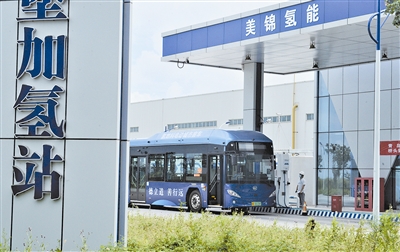 美錦加氫站內(nèi),公交車正在等待加裝氫氣。