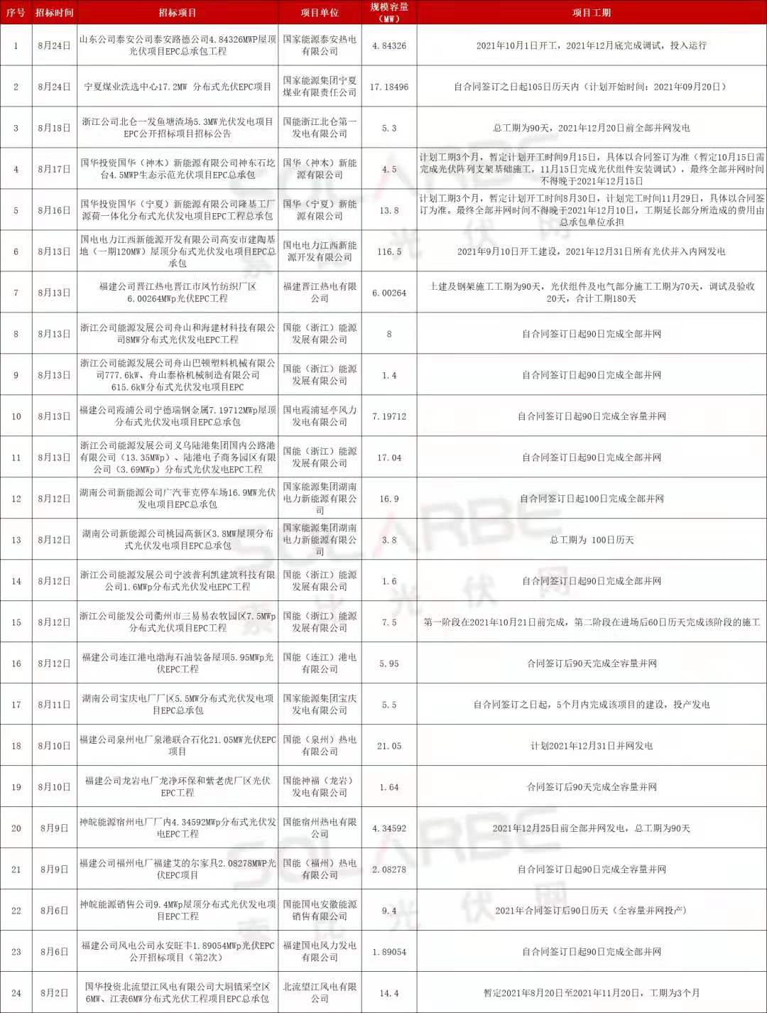 據(jù)索比光伏網(wǎng)統(tǒng)計,國家能源集團在8月份發(fā)布了24個分布式光伏項目EPC招標,裝機容量合計300MW,大多要求年底前并網(wǎng)。