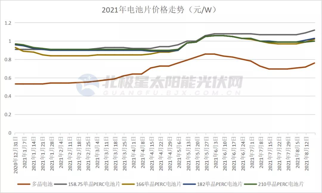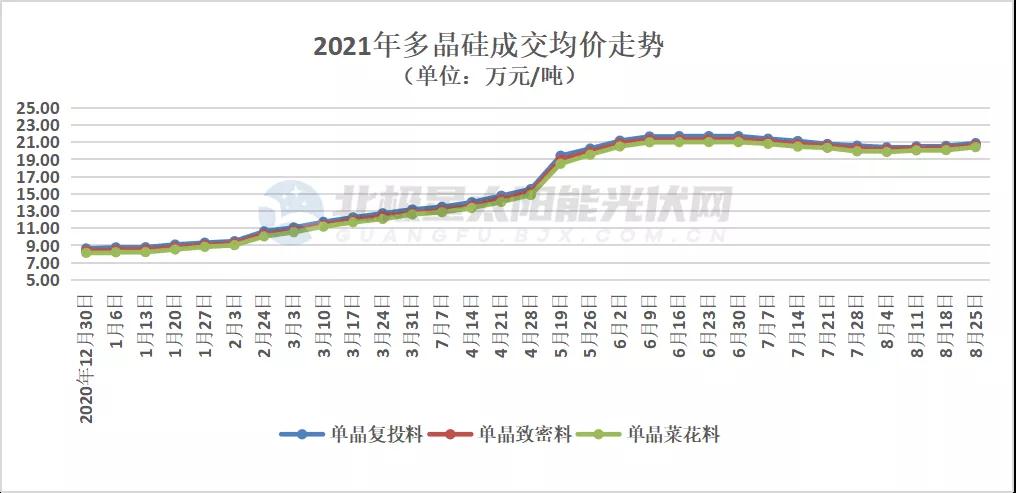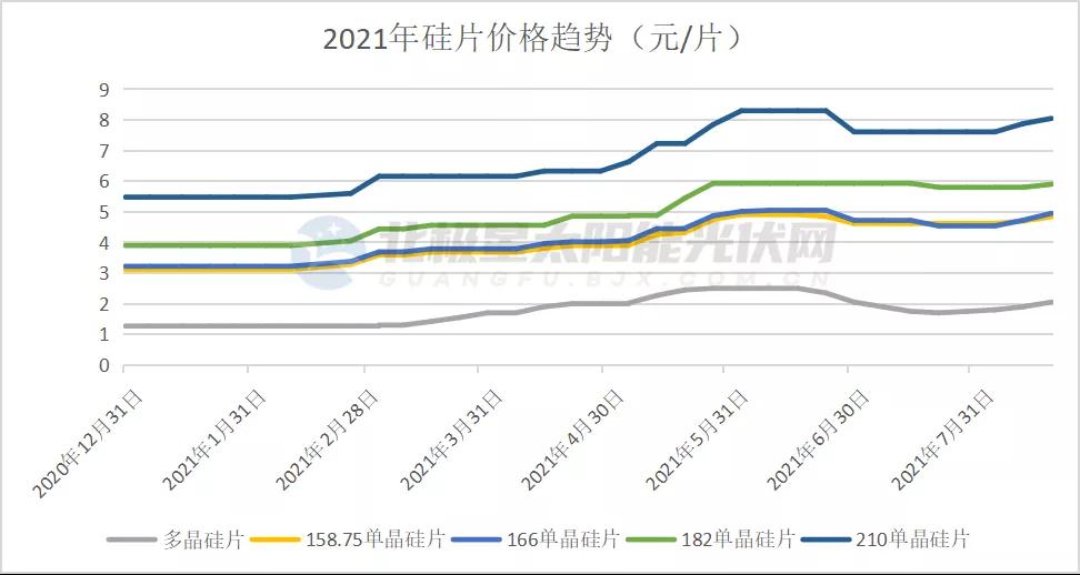 硅料環(huán)節(jié),中國(guó)有色金屬協(xié)會(huì)硅業(yè)分會(huì)數(shù)據(jù)顯示,2021年初至6月中旬,單晶復(fù)投料、單晶致密料、單晶菜花料價(jià)格分別飆漲151%、154%、159%,6月下旬至8月初,價(jià)格連續(xù)維穩(wěn)、下降7周,8月第二周價(jià)格再度反彈,截至本周已連漲三周。