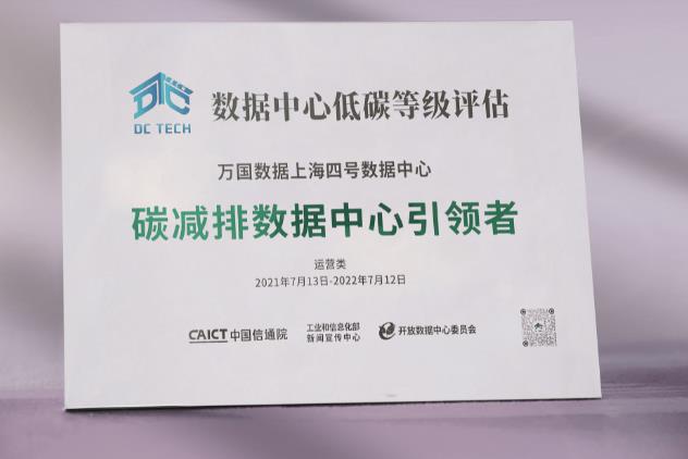 萬國(guó)數(shù)據(jù)上海四號(hào)數(shù)據(jù)中心獲“碳減排數(shù)據(jù)中心引領(lǐng)者”(5A)評(píng)級(jí)