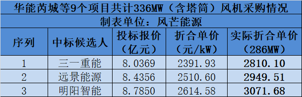 也就是說(shuō),華能芮城這批項(xiàng)目實(shí)際招標(biāo)容量為286MW,三一的本次投標(biāo)折合單價(jià)實(shí)際為2800元/kW。去除塔筒后(按400元/kW-500元/kW來(lái)算),風(fēng)機(jī)折合單價(jià)大概在2300元/kW-2400元/kW左右。