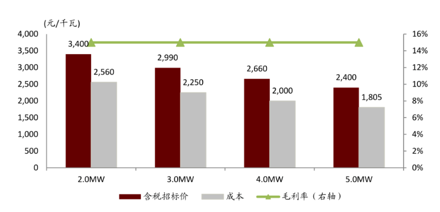 注:理論成本根據(jù)單位功率重量下滑測(cè)算,并假設(shè)15%的毛利率反推出理論招標(biāo)價(jià);未考慮原材料價(jià)格變動(dòng)影響;與實(shí)際情況可能存在偏差,不代表廠商口徑