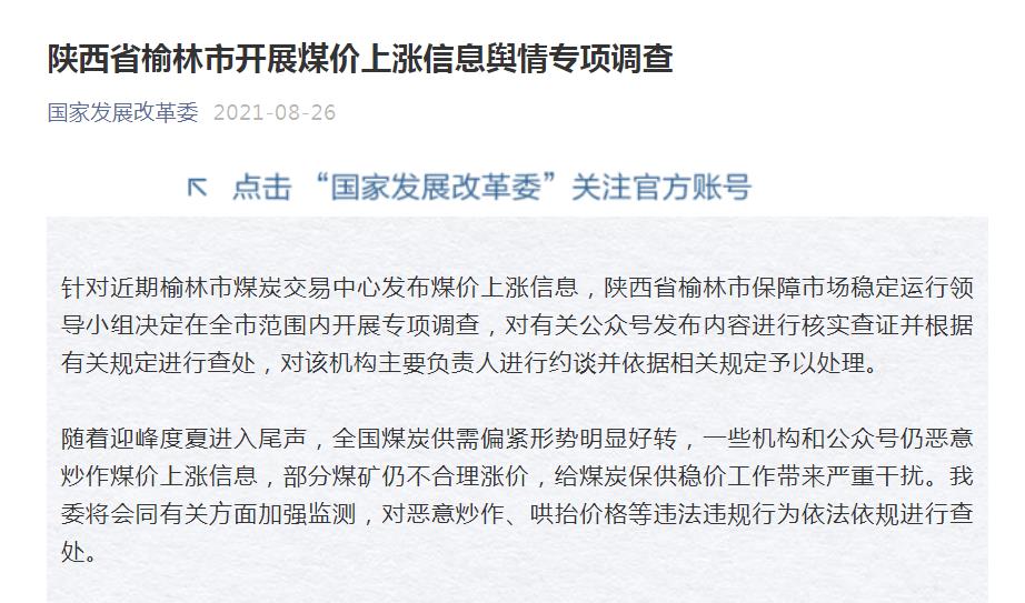 據(jù)國家發(fā)改委官方微信26日消息,針對近期榆林市煤炭交易中心發(fā)布煤價(jià)上漲信息,陜西省榆林市保障市場穩(wěn)定運(yùn)行領(lǐng)導(dǎo)小組決定在全市范圍內(nèi)開展專項(xiàng)調(diào)查,對有關(guān)公眾號(hào)發(fā)布內(nèi)容進(jìn)行核實(shí)查證并根據(jù)有關(guān)規(guī)定進(jìn)行查處,對該機(jī)構(gòu)主要負(fù)責(zé)人進(jìn)行約談并依據(jù)相關(guān)規(guī)定予以處理。