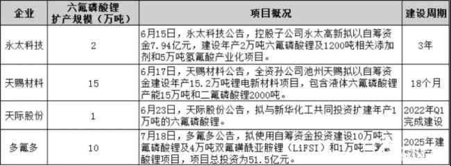 2021.6-2021.7六氟磷酸鋰擴建情況