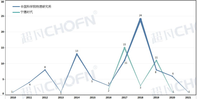 同時,中科院物理所于2010年便申請了1項有關鈉離子電池硬碳粘合劑的專利,其中2018年鈉離子電池相關技術專利申請數(shù)量達到峰值,共24項,其中中科海鈉占據11項。而寧德時代從2016年開始申請,2017年和2019年申請專利量達到峰值分別為15項和11項(由于2019-2021年的專利申請存在未完全公開的情況,故本報告所列圖表中2019-2021年的相關數(shù)據不代表這三個年份的全部申請)。從申請趨勢來看,中科院物理所對鈉離子電池技術的研究更早,研發(fā)持續(xù)性良好。