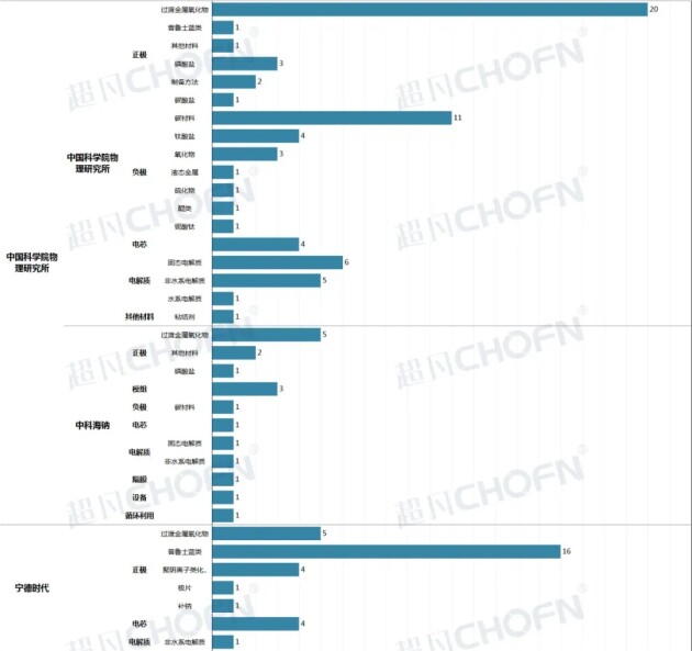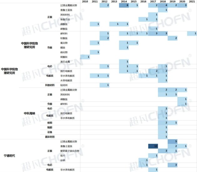 上圖可清晰的反映中科院物理所(中科海鈉)和寧德時代研究重點均在正極材料技術領域。