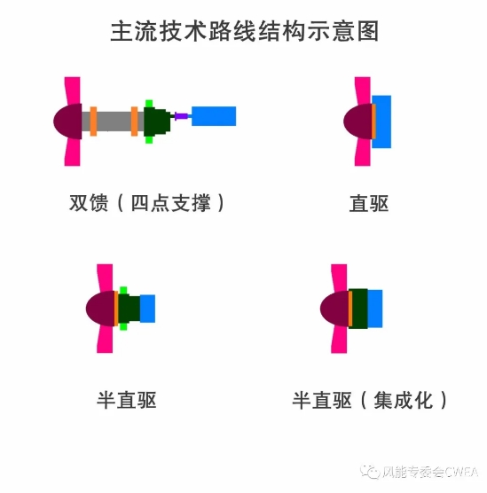 即便是中速傳動技術路線陣營本身,根據(jù)主軸系、齒輪箱與發(fā)電機的集成度與組合關系,也可分為多種形式技術方案。