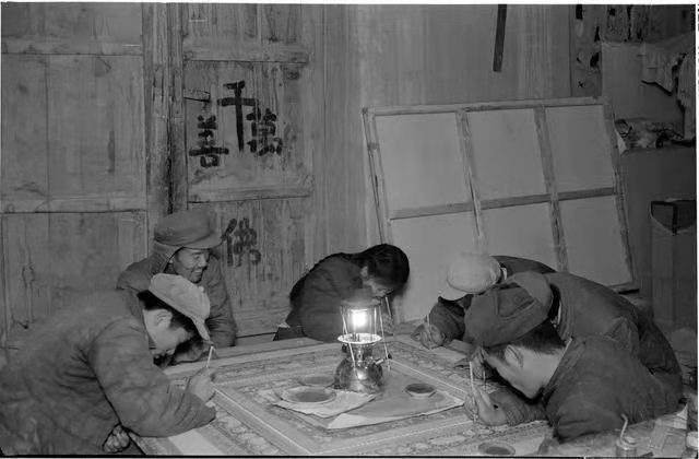 早年間保護(hù)工作者點(diǎn)燈臨摹(資料照片)。(敦煌研究院供圖)