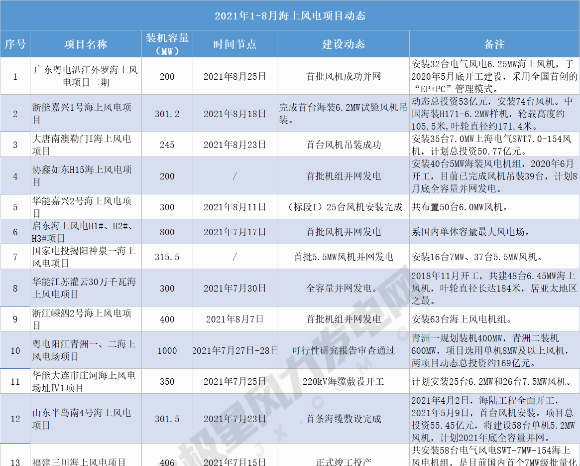 圖1. 2021年1-8月海上風(fēng)電項目建設(shè)動態(tài)
