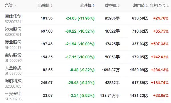 受半年報兌現(xiàn)、產(chǎn)業(yè)鏈價格上漲等因素影響,今日A股光伏板塊也出現(xiàn)大面積暴跌。據(jù)統(tǒng)計,至午間收盤,德業(yè)股份、金辰股份跌停,捷佳偉創(chuàng)、邁為股份跌超10%,大全能源、錦浪科技、三安光電等跌幅較大。