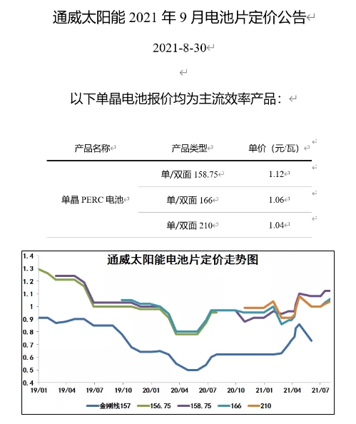 8月30日晚間,通威官網(wǎng)公告更新了9月太陽能電池片指導(dǎo)價,與8月13日公布的數(shù)據(jù)相比,單晶166電池和210電池片價格分別上調(diào)了0.02元/W和0.03元/W。