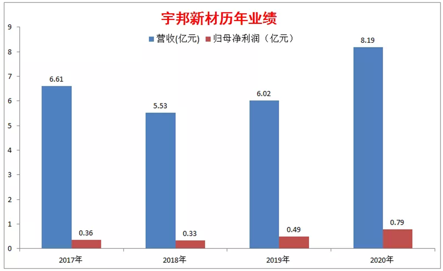 而在2020年我國光伏裝機(jī)量大幅增長的背景下,宇邦新材成功登上了新科組件出貨量冠軍隆基股份的快車,實(shí)現(xiàn)了營收和歸母凈利潤的大幅增長。其中,營收增長了36%,歸母凈利潤增長了61.2%。