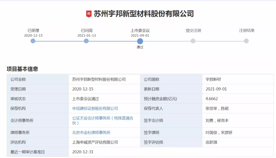 9月1日,據(jù)深圳證券交易所創(chuàng)業(yè)板發(fā)行上市審核信息公開網(wǎng)站顯示,蘇州宇邦新型材料股份有限公司(以下簡稱“宇邦新材”)已通過上市委會(huì)議,將于深交所創(chuàng)業(yè)板上市。
