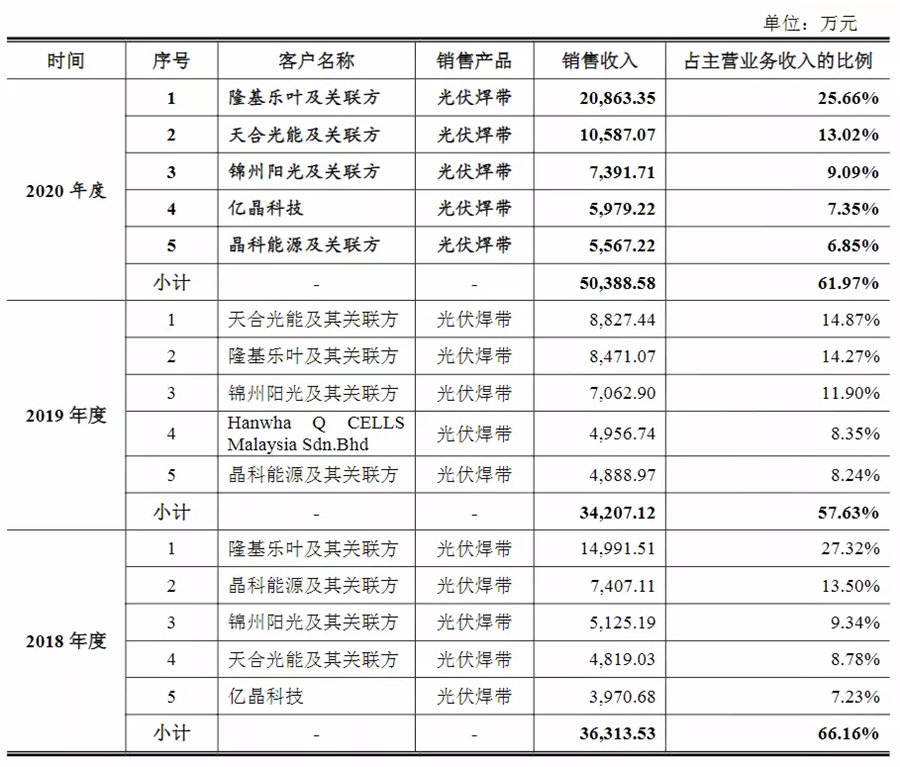 根據(jù)宇邦新材的招股說明書顯示,2019年,隆基股份是宇邦新材的第二大客戶,銷售收入為8471萬元,占比還稍低于天合光能。但在2020年,隆基股份不僅成為了宇邦新材第一大客戶,同時(shí)銷售收入也提高至2.086億元,占比高達(dá)25.66%。是其營收增長的重要支撐。