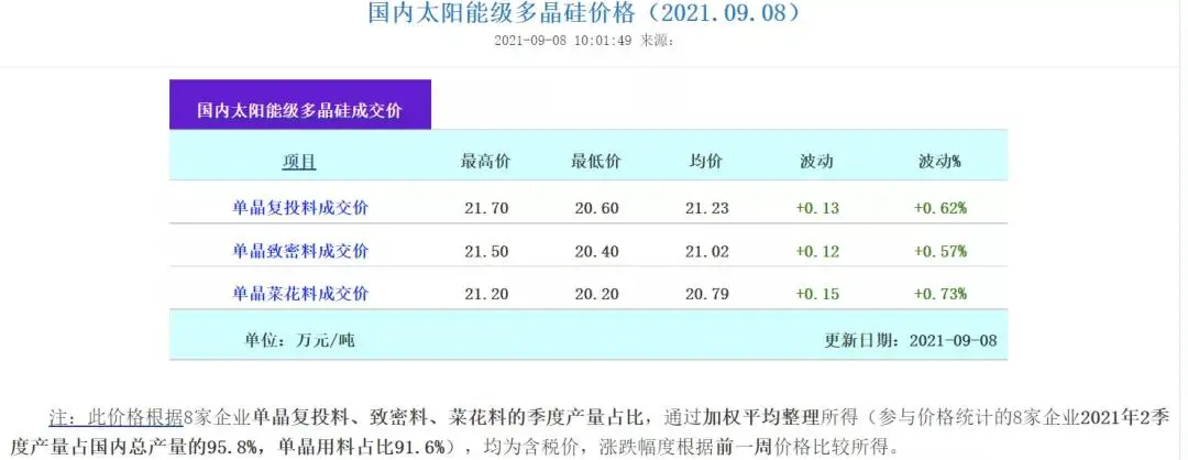 9月8日,硅業(yè)分會(huì)發(fā)布多晶硅最新價(jià)格信息,本周最新單晶復(fù)投料成交價(jià)格在20.6-21.7萬(wàn)元/噸,均價(jià)21.23萬(wàn)元/噸,較上周上漲0.13萬(wàn)元/噸 ;單晶致密料成交價(jià)格區(qū)間在20.4-21.5萬(wàn)元/噸,均價(jià)21.02萬(wàn)元/噸,較上周上漲0.12萬(wàn)元/噸 ;單晶菜花料成交價(jià)格區(qū)間在20.2-21.2萬(wàn)元/噸,均價(jià)20.79萬(wàn)元/噸,較上周上漲0.15萬(wàn)元/噸。