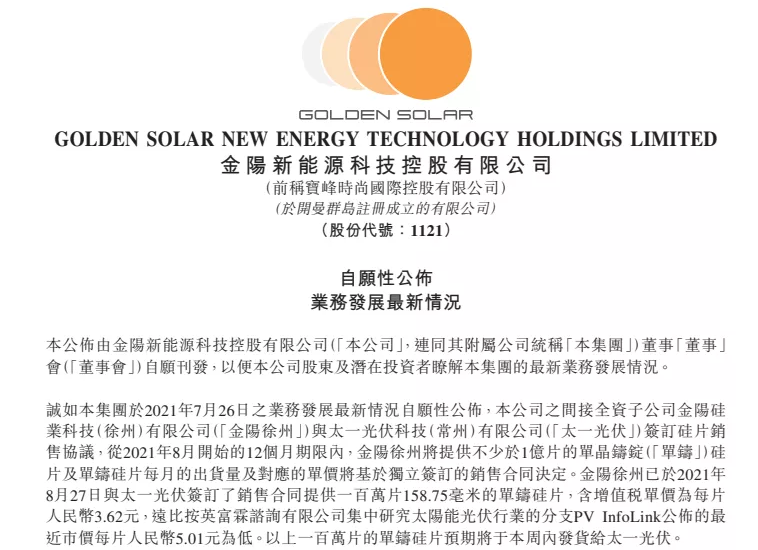 公告稱,公司間接全資子公司金陽(yáng)硅業(yè)科技(徐州)有限公司(以下簡(jiǎn)稱"金陽(yáng)徐州")與太一光伏科技(常州)有限公司(以下簡(jiǎn)稱"太一光伏")簽訂硅片銷售協(xié)議,從2021年8月開(kāi)始的12個(gè)月期限內(nèi),金陽(yáng)徐州將提供不少于1億片的單晶鑄錠("單鑄")硅片及單鑄硅片每月的出貨量及對(duì)應(yīng)的單價(jià)將基于獨(dú)立簽訂的銷售合同決定。