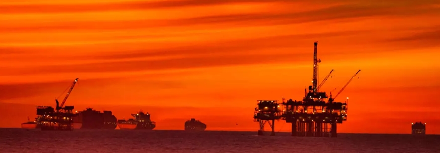 2021年1月12日(星期二),太陽在美國(guó)加州亨廷頓海灘 (Huntington Beach)海岸外的集裝箱船和石油平臺(tái)上落下。