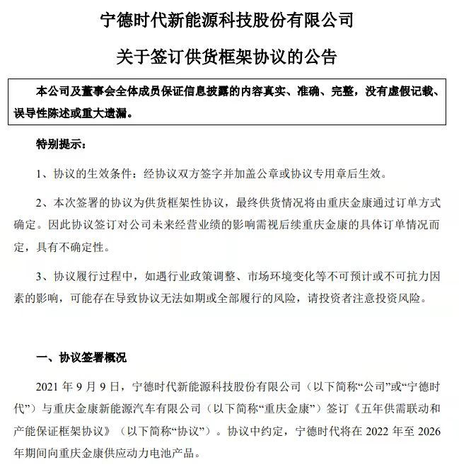 9月10日 寧德時(shí)代發(fā)布公告稱(chēng),與小康股份的控股子公司重慶金康新能源汽車(chē)有限公司簽訂《五年供需聯(lián)動(dòng)和產(chǎn)能保證框架協(xié)議》。協(xié)議中約定,寧德時(shí)代將在2022年至2026年期間向重慶金康供應(yīng)動(dòng)力電池產(chǎn)品。