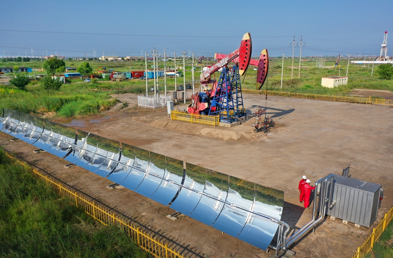 中國(guó)石化勝利油田孤東采油廠采油管理四區(qū)員工正在孤東287平5井井場(chǎng)檢查槽式太陽(yáng)能集熱器的運(yùn)行參數(shù)及油井運(yùn)行情況。(央廣網(wǎng) 發(fā) 通訊員 供圖)