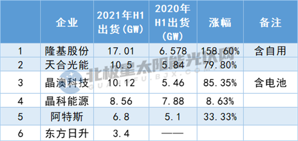 分來看來,隆基股份以17.01GW蟬聯(lián)全球第一,組件出貨量較去年同期大漲158.60%、隆基在財(cái)報(bào)中指出,其組件收入占比由 2020年上半年的57%提升至2021年上半年的67%。