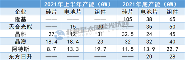 截至2021年6月30日,晶科內(nèi)部單晶硅片、太陽能電池和太陽能組件年產(chǎn)能分別為27GW、12GW(N型電池940MW)和31GW。到2021年底,其單晶硅、太陽能電池和太陽能組件的年產(chǎn)能分別達(dá)到32.5 GW、24GW(包括 940 MW N 型電池)和 45GW。