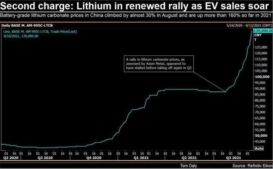 由于電動汽車銷量激增,全球鋰價躍升至逾3年高點(diǎn),分析人士表示,鋰礦供應(yīng)日益吃緊,若新礦開采速度遲緩,可能影響電動汽車生產(chǎn)交付速度。