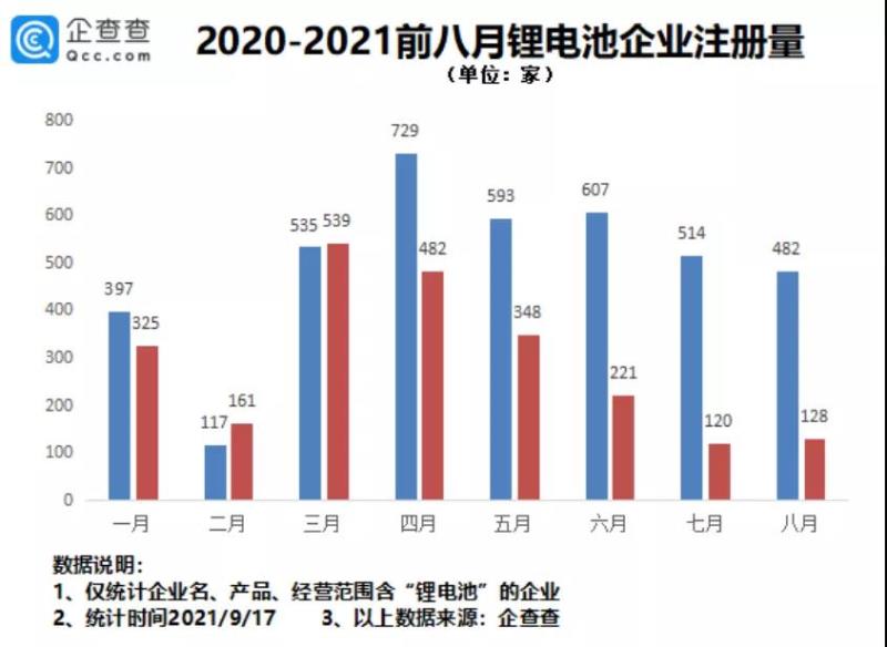 2021年1-8月,國內(nèi)新增鋰電池相關(guān)企業(yè)共2324家,同比下滑41.5%。