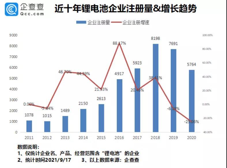 2018年新增8198家,同比增長38.41%。是近十年來新增鋰電池企業(yè)最多的年份。2019年、2020年受補貼退坡以及新冠疫情等影響,分別新增鋰電池相關(guān)企業(yè)7691家、5764家,逐漸呈下滑趨勢。