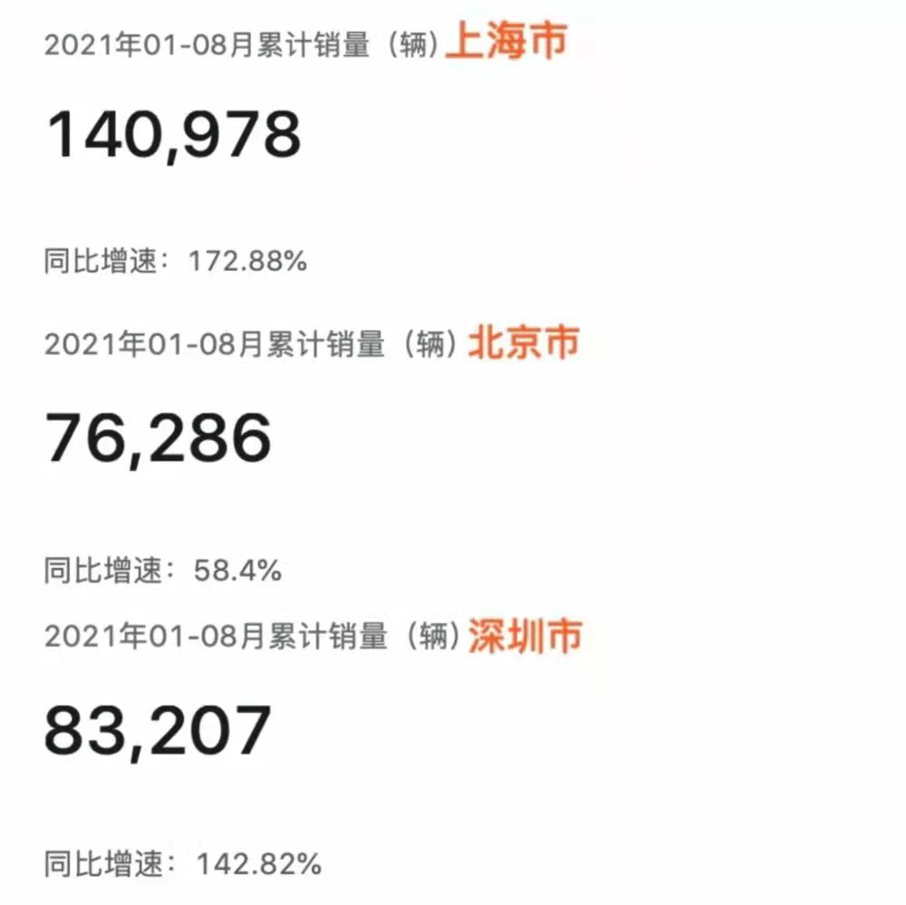 從今年全國(guó)前8個(gè)月的新能源車銷量數(shù)據(jù)來(lái)看,上海市一騎絕塵,達(dá)到140978輛,同比增漲172.88%,而北京和深圳前8個(gè)月的新能源銷量總和才為159493輛,上海市新能源車型的銷量已經(jīng)接近北京和深圳總和。
