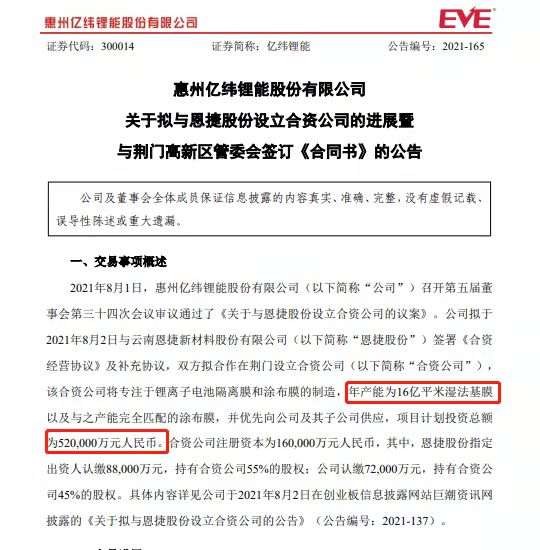 9月22日,億緯鋰能發(fā)布公告稱(chēng),公司擬與上海恩捷在荊門(mén)高新區(qū)共同設(shè)立合資公司并由合資公司投資建設(shè)高性能鋰電池隔膜項(xiàng)目事宜簽署《合同書(shū)》。該項(xiàng)目總投資約52億元,將建設(shè)16條鋰電池隔膜生產(chǎn)線(xiàn)。