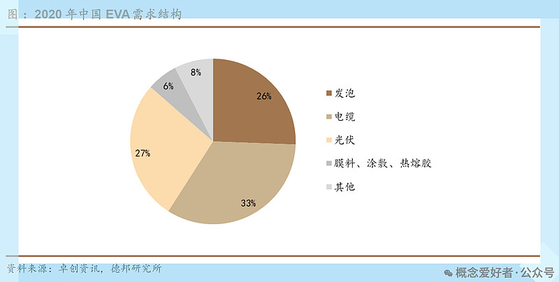 EVA就是乙烯-醋酸乙烯制共聚物,EVA被廣泛應用于發(fā)泡鞋料、功能性棚膜、包裝膜、熱熔膠、電線電纜及玩具等領域。EVA的性能主要取決于MI(熔融指數(shù))和VA(醋酸乙烯脂)的含量,光伏級EVA是一種高VA、高MI的高端產品。光伏已發(fā)展為EVA的重要應用領域。近年來,隨著光伏行業(yè)蓬勃發(fā)展,帶動光伏級EVA需求持續(xù)上升,2020年中國光伏級EVA需求已占比約27%,成為重要的應用領域。