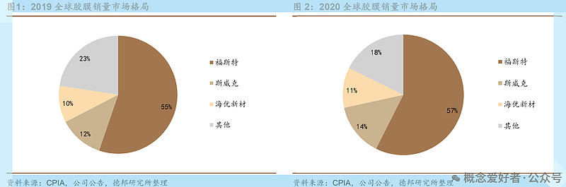 下游光伏膠膜行業(yè)一超兩強格局穩(wěn)固,產能主要集中在國內。2020年光伏膠膜行業(yè)CR3為82.34%,同比提升4.89%。其中,福斯特作為光伏膠膜行業(yè)的絕對龍頭,2020年全球市場占有率約57.42%,為國內EVA企業(yè)帶來了穩(wěn)定的需求。