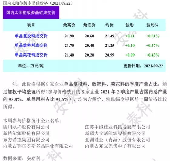 本周多晶硅價格繼續(xù)小幅上漲,其中單晶復投料、單晶致密料、單晶菜花料成交均價漲幅在0.5%左右,一線大廠新簽的少量復投料訂單最新成交價在21.7萬元/噸以上,略有上調(diào),其余企業(yè)本周少有簽單,只有個別散單和補單成交,價格相對持穩(wěn),故本周硅料價格依舊延續(xù)小幅上漲的走勢。本周硅料價格延續(xù)漲勢的原因,一方面仍是由于目前硅料供應量不及下游開工率提升帶動的需求,供不應求從根本上支撐了價格上漲的趨勢;另一方面,各地因能耗雙控限產(chǎn)和原材料價格上漲等因素導致工業(yè)硅粉價格屢屢翻倍創(chuàng)新高,多晶硅料成本隨之大幅增加,再疊加硅粉供應短缺的市場預期,推動硅料繼續(xù)小幅上漲。