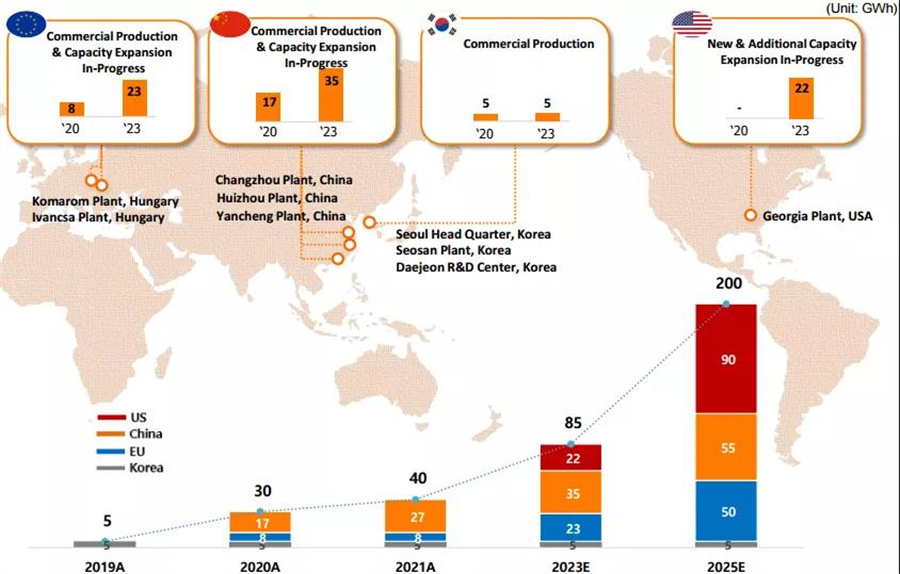 和其他廠商一樣,近年來,SKI也在大力擴張,除了韓國本土外,還在中國、美國和歐洲不斷擴大業(yè)務范圍。其中,該公司設在美國喬治亞州,主要供應大眾集團和福特的電池工廠已經(jīng)動工建設。在歐洲國家匈牙利,該公司也規(guī)劃建設了兩座電池工廠。在中國,該公司日前宣布,將在江蘇鹽城建設其在華第四座電池工廠,而其前三座工廠分別位于江蘇常州、鹽城和惠州。目前,SKI的全球電池年產(chǎn)能為40GWh,經(jīng)過多地擴張后,預計2025年將達到200GWh,2030年增加到500GWh以上。