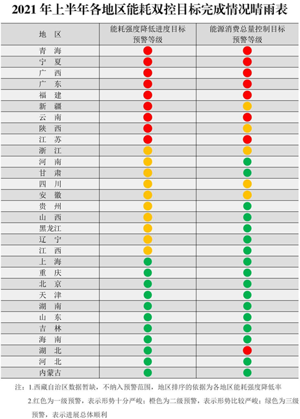 今年8月17日,國家發(fā)展改革委發(fā)布《關(guān)于印發(fā)<2021年上半年各地區(qū)能耗雙控目標(biāo)完成情況晴雨表>的通知》。根據(jù)《晴雨表》,能耗強(qiáng)度降低方面,今年上半年,青海、寧夏、廣西、廣東、福建、新疆、云南、陜西、江蘇9個省(區(qū))能耗強(qiáng)度不降反升,為一級預(yù)警。