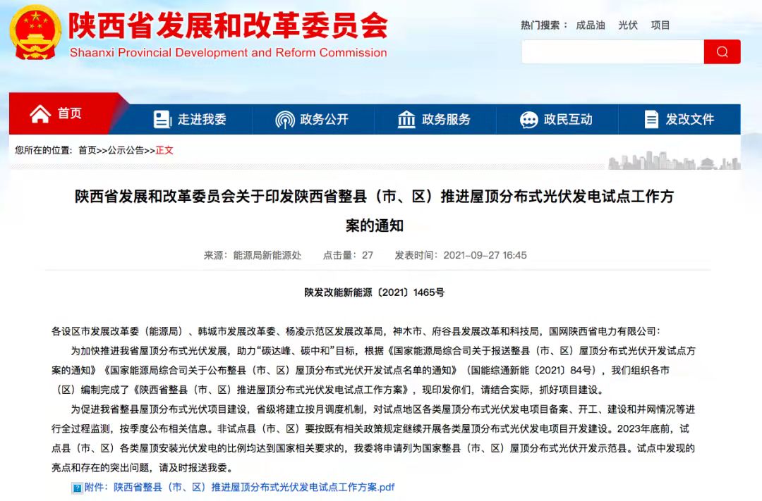 陜西省發(fā)展和改革委員會關(guān)于印發(fā)陜西省整縣(市、區(qū))推進(jìn)屋頂分布式光伏發(fā)電試點(diǎn)工作方案的通知