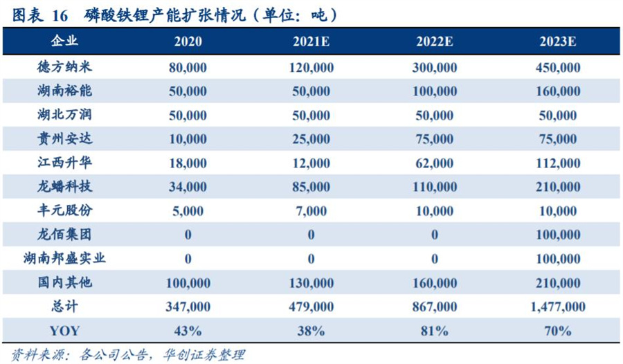 景氣高企甚至帶動了中核鈦白、龍蟒佰利等化工行業(yè)龍頭集中跨界,試圖憑借自身磷礦資源優(yōu)勢占據(jù)高點,但華創(chuàng)證券上述報告認(rèn)為,大部分企業(yè)是從前驅(qū)體磷酸鐵切入,對于磷酸鐵鋰布局信息較少,短期內(nèi)對行業(yè)邊際產(chǎn)能貢獻(xiàn)有限。