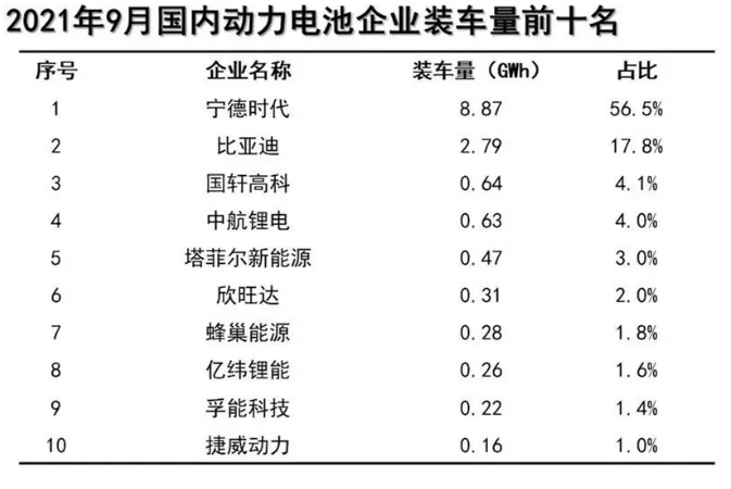 9月,我國動(dòng)力電池裝車量前十名的企業(yè)分別是寧德時(shí)代、比亞迪、國軒高科、中航鋰電、塔菲爾新能源、欣旺達(dá)、蜂巢能源、億緯鋰能、孚能科技、捷威動(dòng)力。