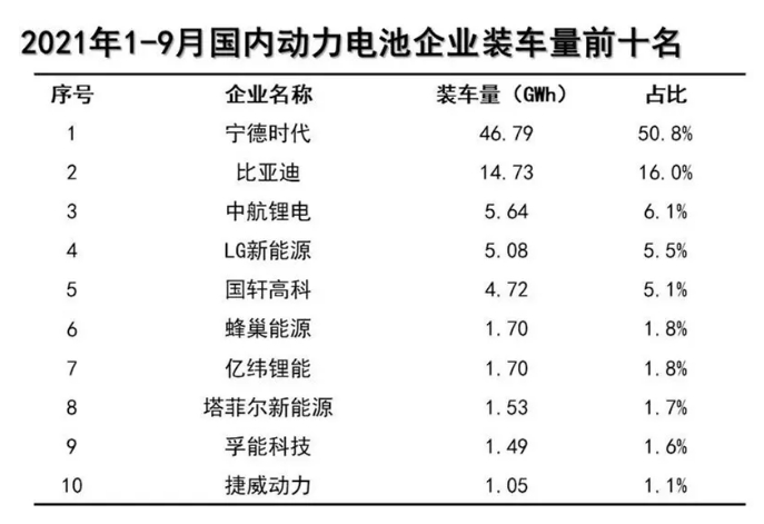 1-9月,我國動(dòng)力電池裝車量前十名的企業(yè)分別是寧德時(shí)代、比亞迪、中航鋰電、LG新能源、國軒高科、蜂巢能源、億緯鋰能、塔菲爾新能源、孚能科技、捷威動(dòng)力。
