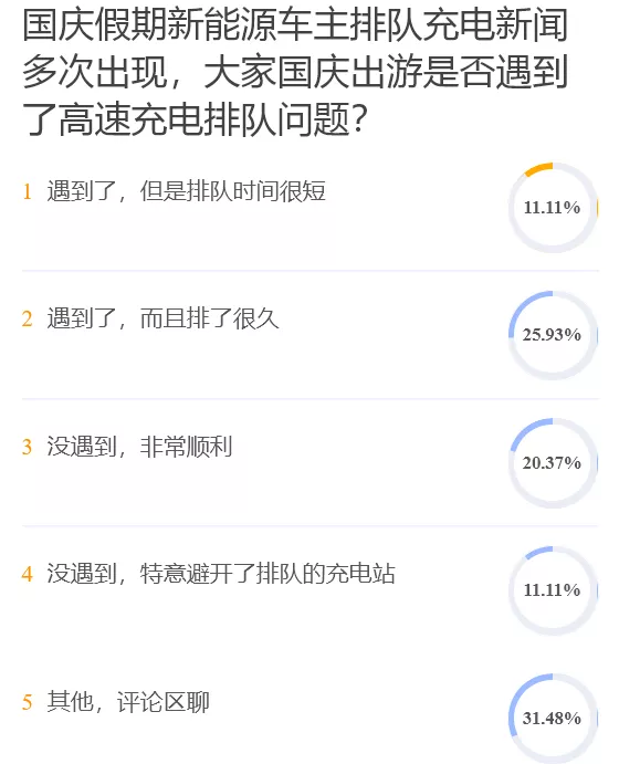 以電動(dòng)車用戶為主的網(wǎng)站電動(dòng)邦國慶后做了一項(xiàng)調(diào)查,近百位在長假開電動(dòng)車出行的用戶中,選擇排隊(duì)很久和非常順利的占比只相差5個(gè)百分點(diǎn),選擇遇到排隊(duì)問題和沒遇到問題的用戶也幾乎相同。這些來自電動(dòng)車主的聲音比社交媒體上的吐槽更能反應(yīng)真實(shí)情況。