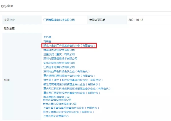 企查查顯示,贛鋒鋰電近日新增多位股東,其中包括湖北小米長江產(chǎn)業(yè)基金合伙企業(yè)(有限合伙)(以下簡稱“小米產(chǎn)投”)。