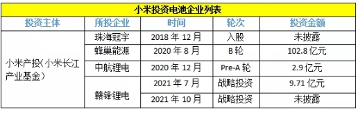 導(dǎo)讀:小米已經(jīng)投資了珠海冠宇、蜂巢能源、中航鋰電、贛鋒鋰電等電池企業(yè)。