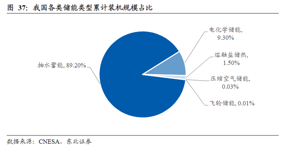 東北證券研究表示,當前,在我國各類儲能類型累計裝機規(guī)模中,抽水蓄能占比為89.20%;電化學儲能占比為9.30%;熔融鹽儲熱占比為1.50%;壓縮空氣儲能占比為0.03%;飛輪儲能占比為0.01%。