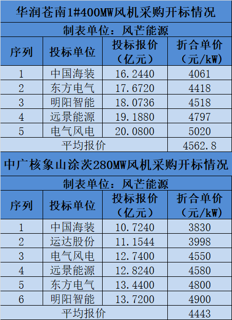 風芒能源獨家獲悉,日前,華潤蒼南1#400MW海上風電項目風機采購(含塔筒)中標候選公示,中國海裝以4061元/kW的折合單價中標。該項目共有5家整機商競標,平均投標報價4563元/kW。